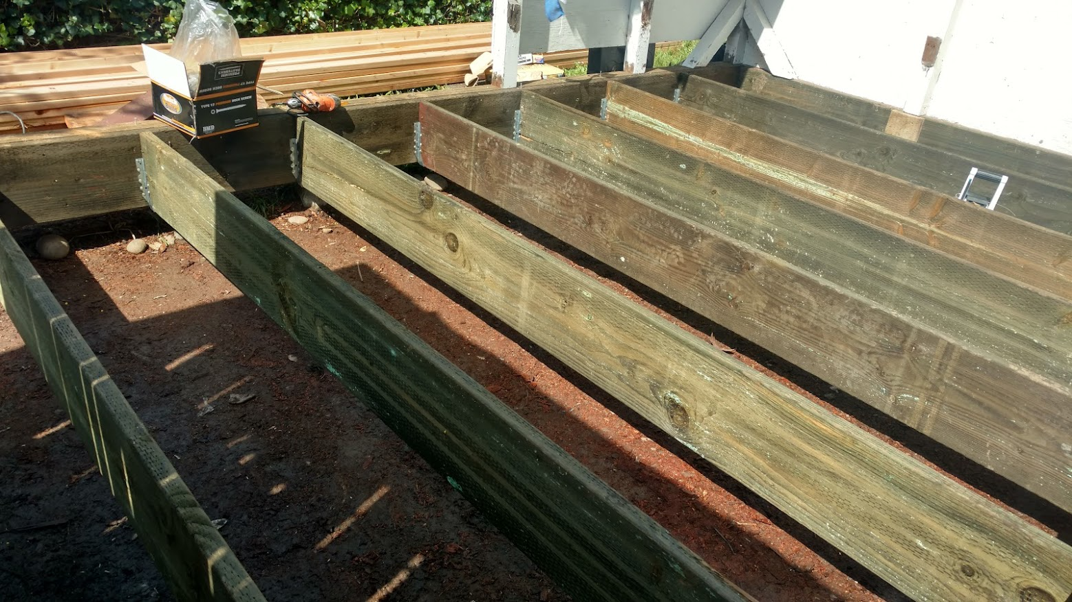 New deck on the back of the house. We use pressure treated 2x12 for floor joists and the framing we used 2x6 cedar decking boards for the decking.